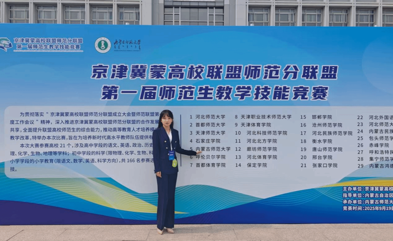 京津冀蒙高校联盟师范分联盟师范生教学技能竞赛,是汇聚区域师范教育优质资源、搭建师范生专业成长与交流展示的高端平台,不仅为我院师范生提供了检验学习成果、切磋教学技艺的宝贵机会,更成为直观展现我院师范生培养质量、彰显师范教育办学特色的重要窗口。此次比赛是韩冰同学在ok138太阳集团古天乐第十三届师范生教师技能比赛、ok138cn太阳集团第十三届师范生技能竞赛、第十四届全国高校思政教育师范生教学技能比赛中先后荣获一等奖之后,再次取得佳绩。下一步,学院将以比赛为重要契机,进一步优化“厚基础、强实践、重创新”的培养宗旨,为基础教育事业输送更多师德高尚、业务精湛的新时代人才。